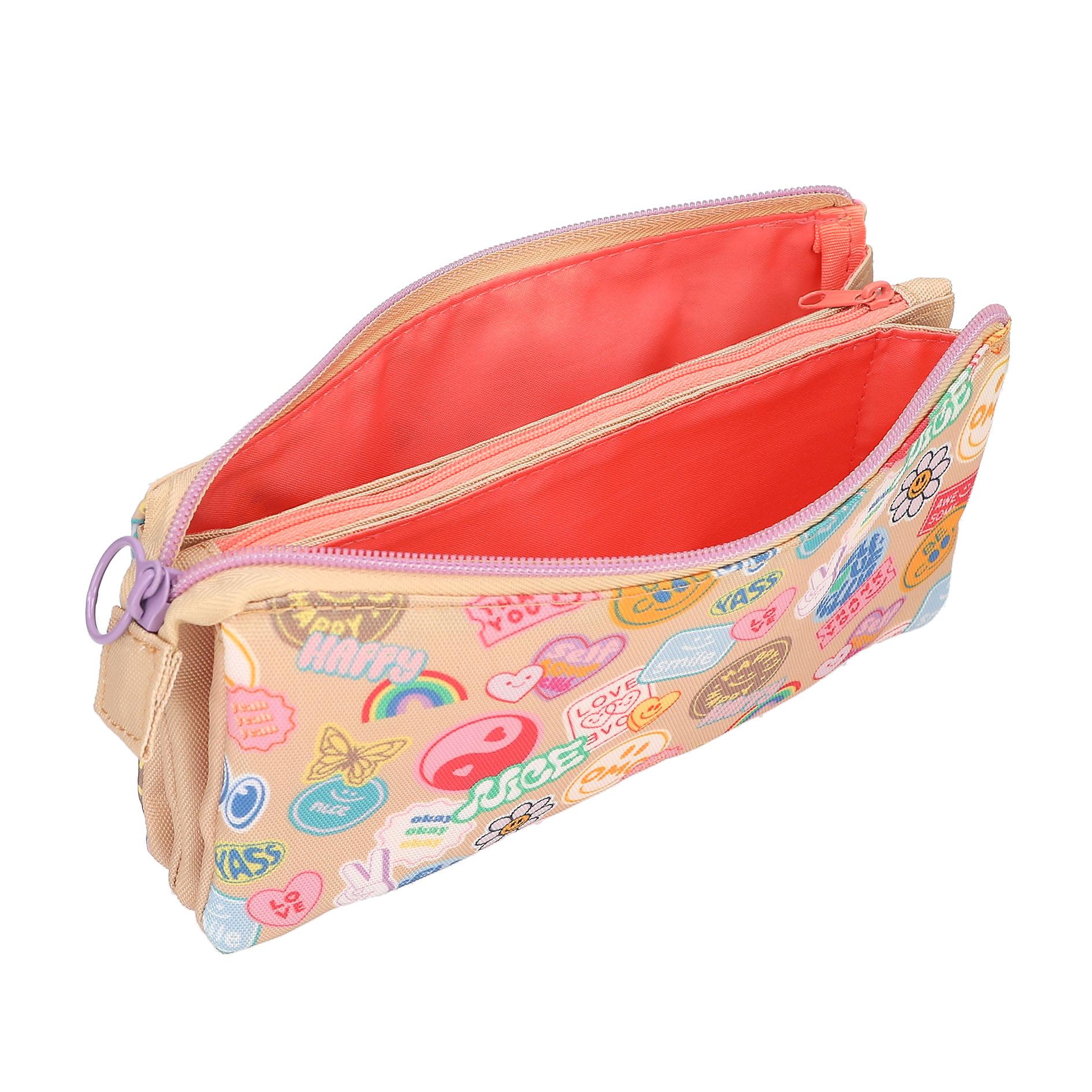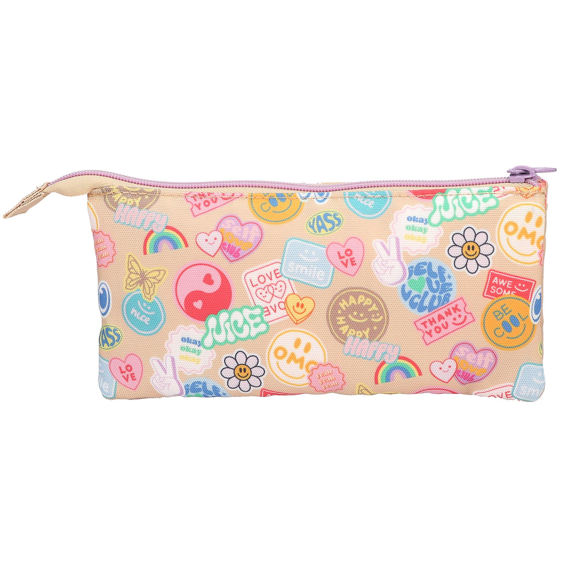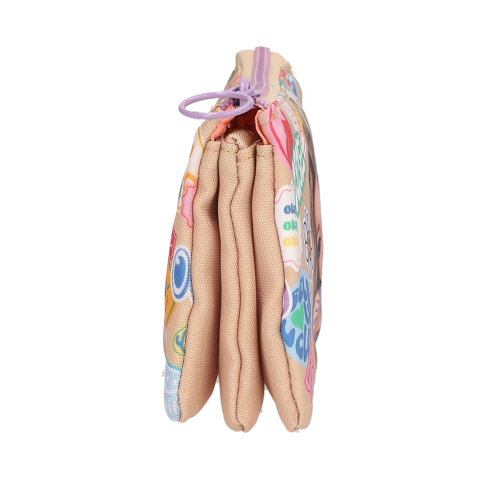 Batch-Boom! Este estuche beige de TOPModel lleva la cara delantera decorada con un motivo precioso de dos modelos rodeadas de parches en imitación de chulísimas pegatinas coloridas. El interior de sus tres compartimentos está forrado en color coral y el compartimento central tiene su propia cremallera. Material: poliéster 100 por 100.