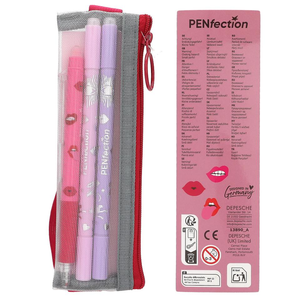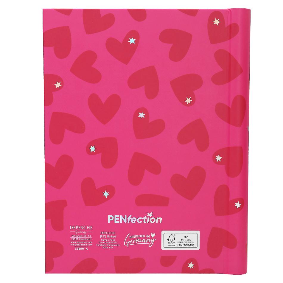Good karma! Este set de notas de PENfection destaca por sus estilosos iconos de fantasía y adornos florales metalizados en dorado. Los tres elementos de escritura incluidos (2 fluorescentes rosa/azul, 1 bolígrafo de gel) son borrables y vienen guardados en un estuche de red fijado a la cinta elástica que cierra el bloc. El bloc, con tapas de cartón resistente y encuadernado en práctico espiral, tiene las páginas con pauta de líneas y pequeñas ilustraciones. En un bolsillo interior tipo sobre se incluye una hoja de pegatinas para decorar y marcar.