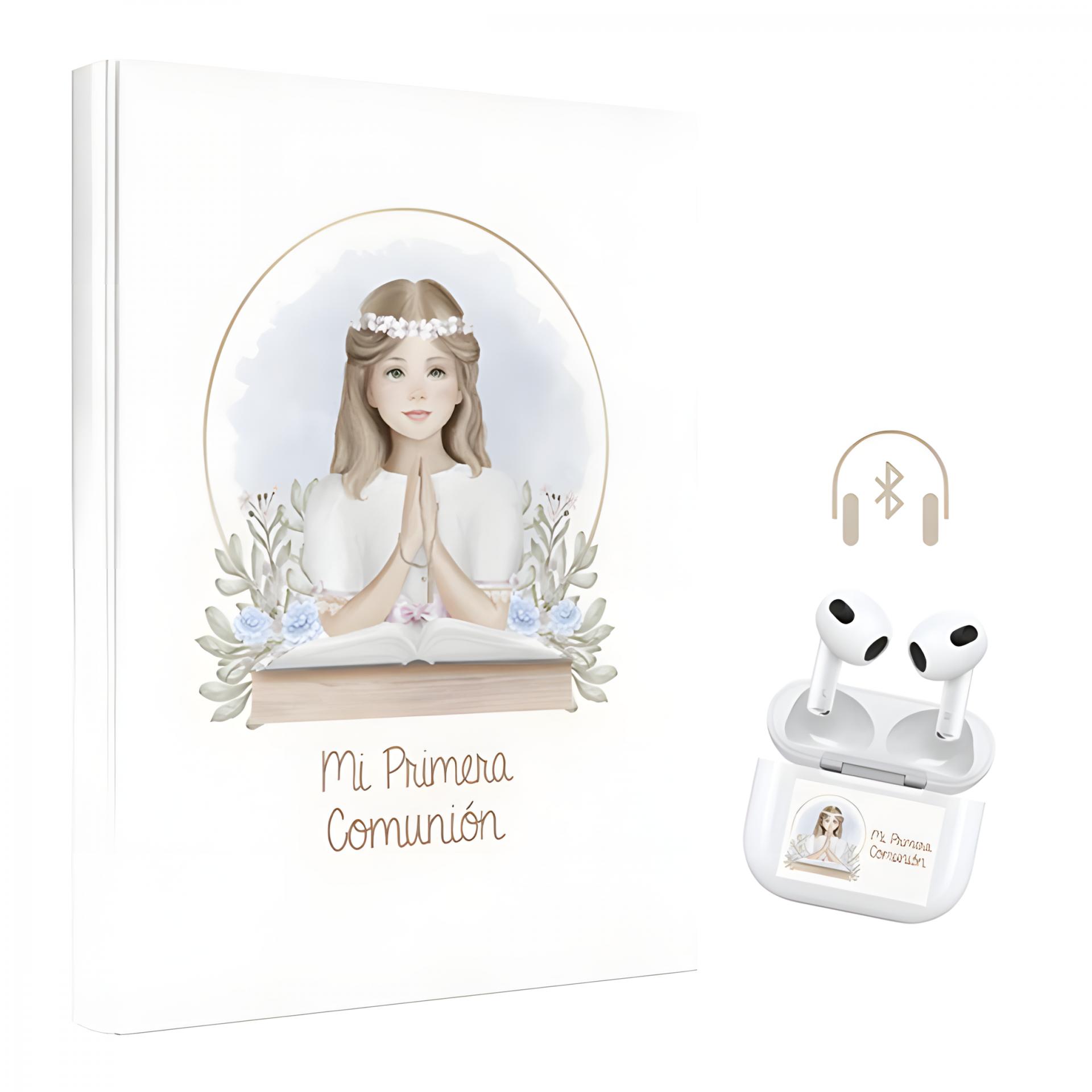 LIBRO DE FIRMAS Y ALBÚM DE FOTOS NIÑA ORLA 26 PRIMERA COMUNIÓN, CON AURICULARES INALÁMBRICOS DE REGALO