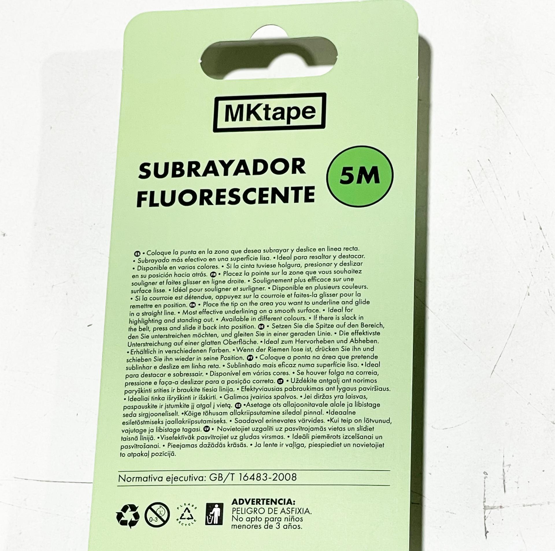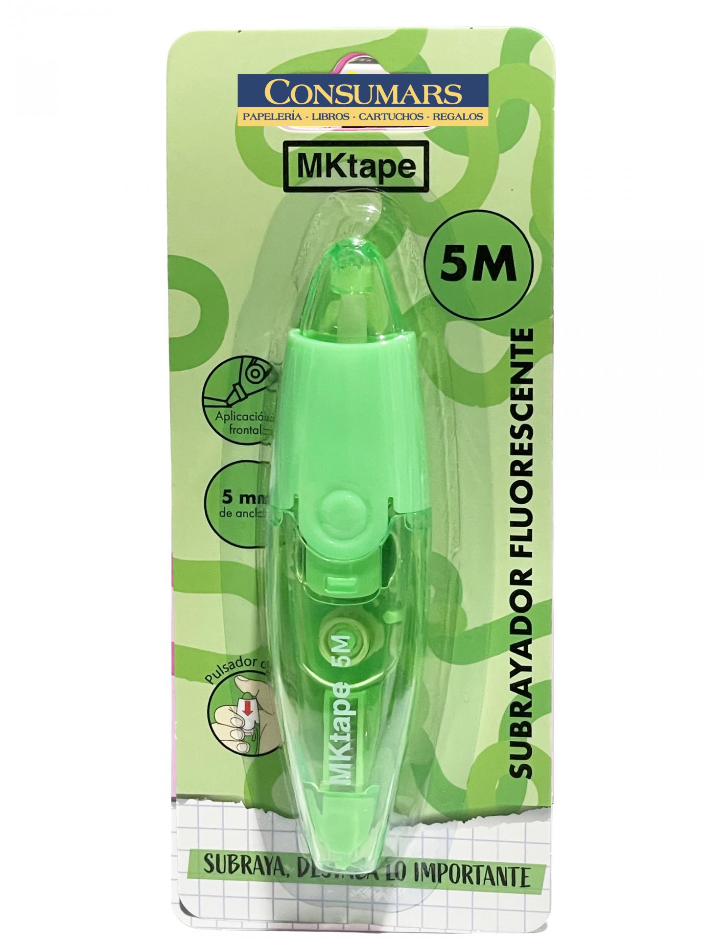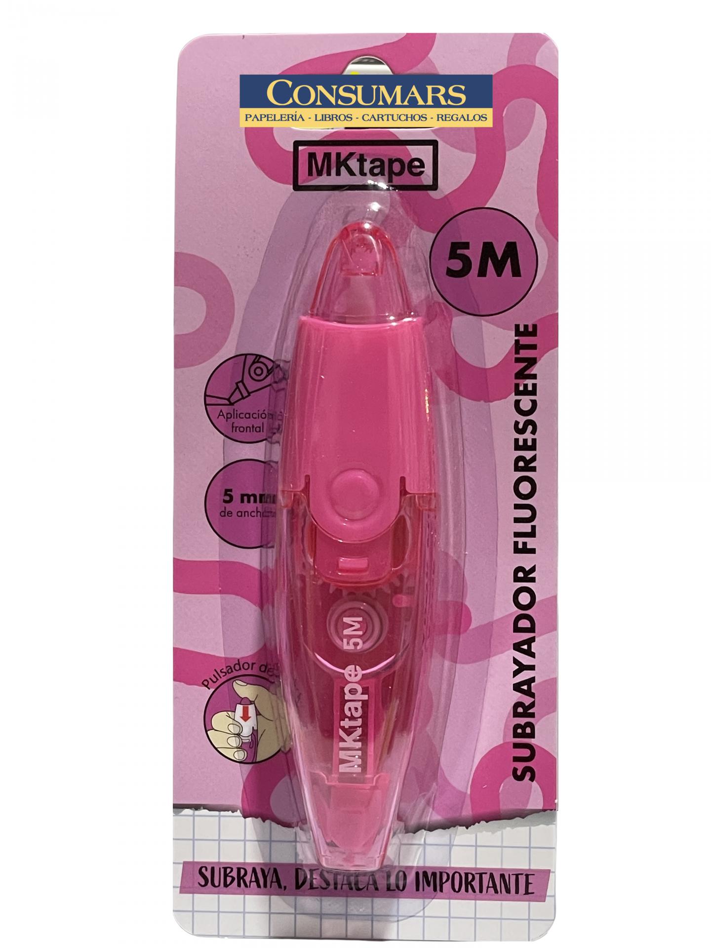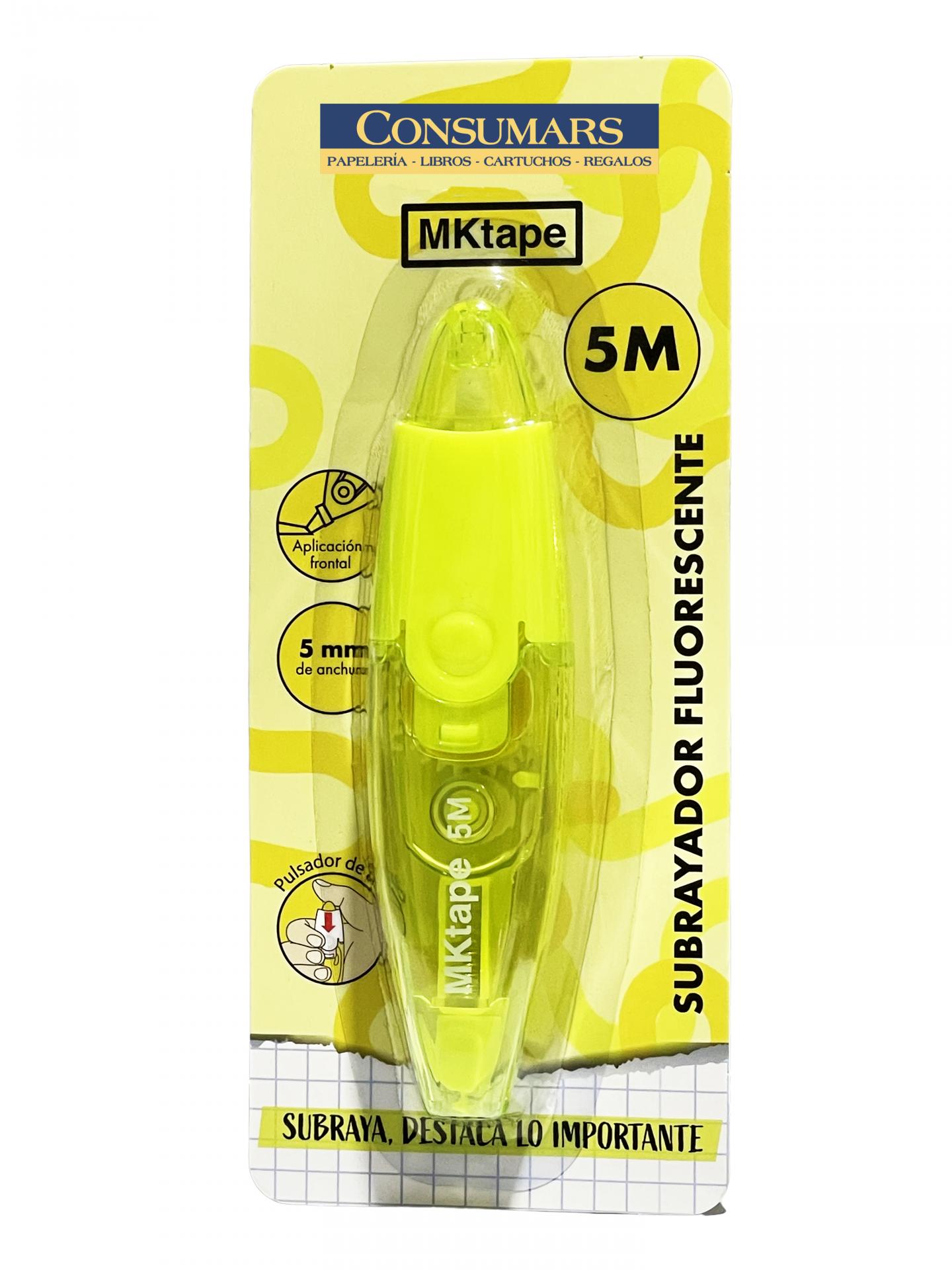 Subrayador fluorescente retráctil en cinta de aplicación frontal. Ideal para resaltar y destacar. Ancho del subrayador 5mm x 5 metros.